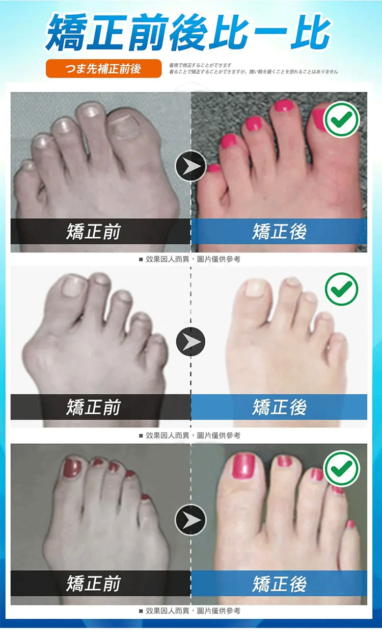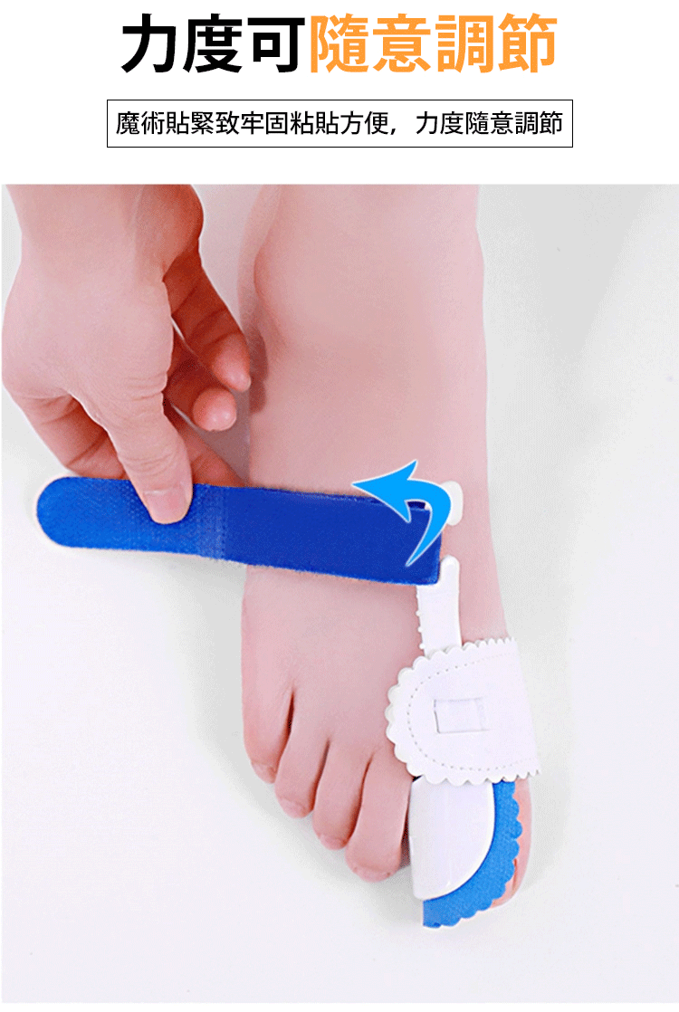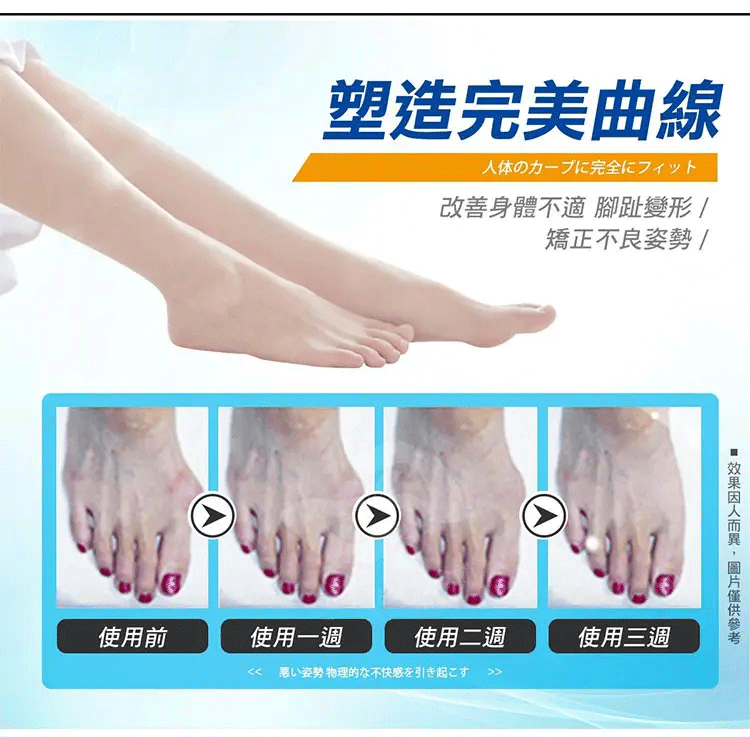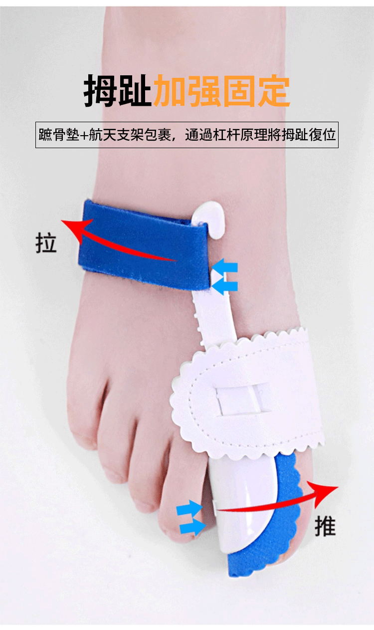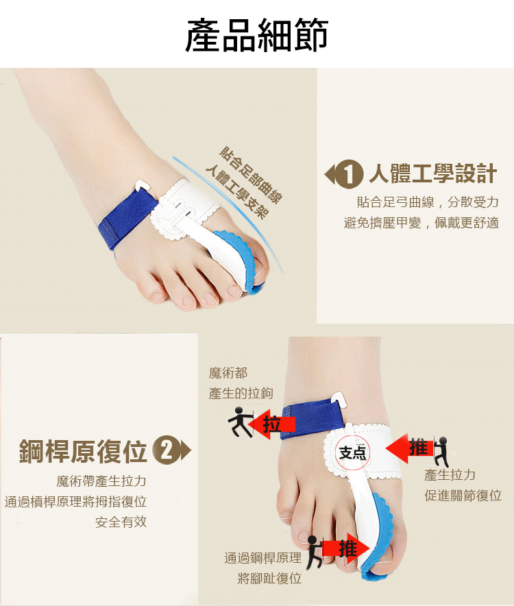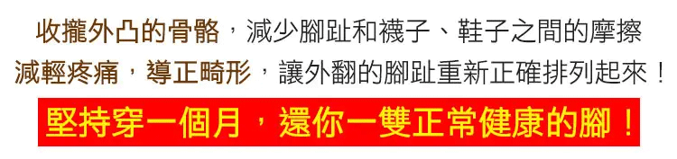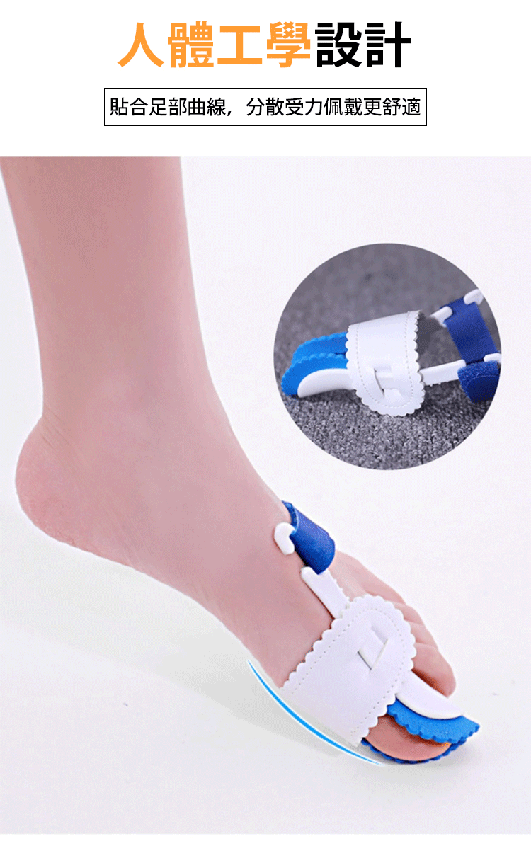 精選舒適材質,人體工程學設計,貼合足部曲線,分散受力,佩戴更舒適,收攏外凸骨骼,減少腳趾摩擦,減輕疼痛,矯正畸形,讓外翻的腳趾重新排列起來,協助您治愈拇指外翻,還您健康的腳趾。