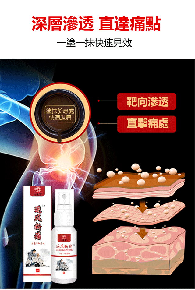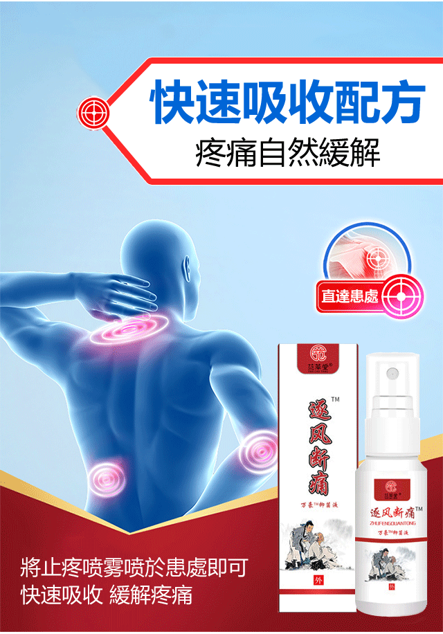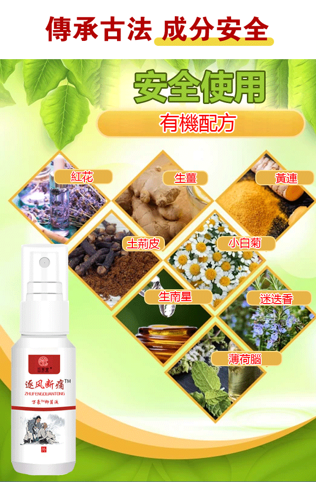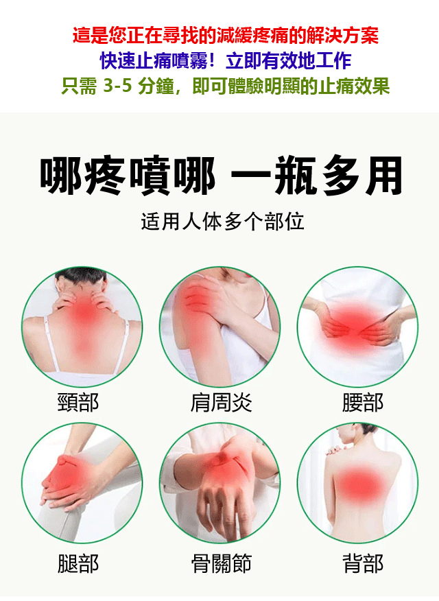 傳承古法,有機配方,安全使用,靶向滲透,直擊痛處,快速止痛鎮痛,一瓶多用,適用人體多個部位,化瘀行氣,消腫止痛,舒筋活絡,跌打損傷,頸肩關節,哪裡不適噴哪裡,隨時隨地即噴止痛,享受健康生活。